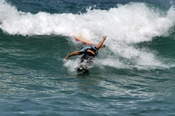 He fotografiado a cientos de estos turistas, la mayoría tienen entre 25 y 35 años, usan las mismas chancletas, la misma ropa, los mismos lentes de sol y los mismos gorritos con visera. Vienen de los países más fríos del hemisferio norte donde no hay mar o donde el mar esta poluído y/o congelado la mayor parte del año. Compraron mucho antes de salir de casa el atuendo completo de surfista de revista y llegan aquí a lucir esas bermudas y musculosas coloridas sobre sus pieles blancas como la leche que al segundo día de trópico están rojas como el tomate.